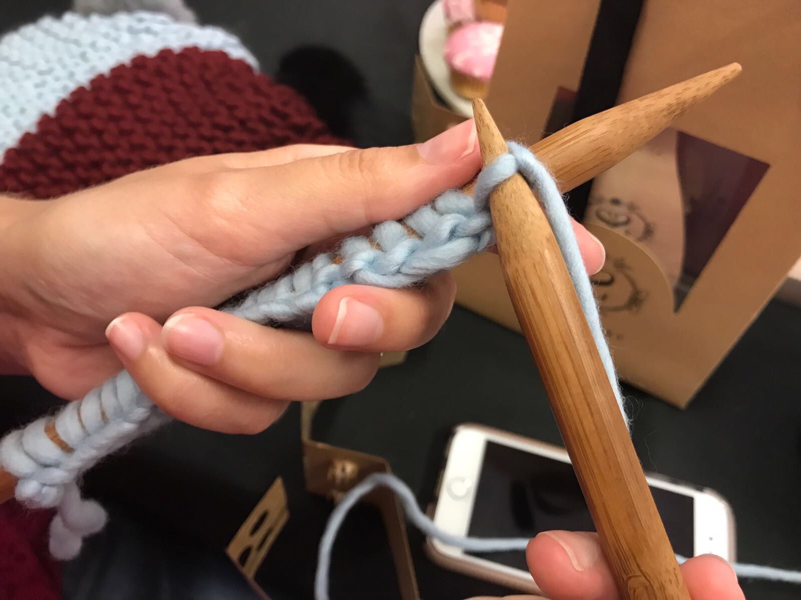 I was apprehensive but the smiling faces from the two Jens encouraged me to take a seat and try my hand at using one of the beanie kits they had there. I chose my hat colour and slowly remembered how to cast on stitches on to one of the large bamboo needles with a little help from Jen and the easy to understand in-kit guide.